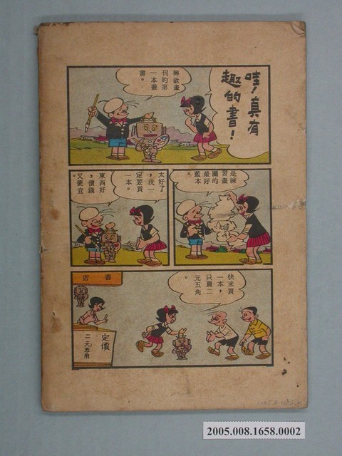 1.本件《興欽畫刊69-機器人幫泰山決戰象牙谷(2)》,以壞人持槍與動物接觸,機器人和小金馳往支援為主題,內容敘述小金和機器人了解了壞人的意圖,而擬協助泰山的情節。封底則為漫畫的廣告。2.劉興欽於1934年出生於今新竹縣橫山鄉,1954年開始畫漫畫。其正式投入漫畫,是擔任北市永樂國小教師期間。1971年到1979年從事發明,獲得國內專利140多項、國際專利43項。於1991年移民美國舊金山,在《北美世界日報》連載漫畫「大嬸婆在美國」,並於舊金山創立「大嬸婆創意學校」免費教導華人子弟學習母語,同時也致力於「臺灣民俗紀錄」畫作,至今已經累積302多幅作品。該漫畫家以〈阿三哥與大嬸婆〉等漫畫,著稱於世。