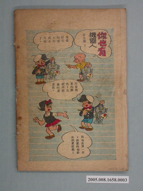 1.本件《興欽畫刊71-機器人幫泰山決戰象牙谷(4)》,封面以部落原住民收留了小金等人,而機器人與原住民溝通的情景。內容敘述小金和機器人到了森林部落以後的遭遇。2.劉興欽於1934年出生於今新竹縣橫山鄉,1954年開始畫漫畫。其正式投入漫畫,是擔任北市永樂國小教師期間。1971年到1979年從事發明,獲得國內專利140多項、國際專利43項。於1991年移民美國舊金山,在《北美世界日報》連載漫畫「大嬸婆在美國」,並於舊金山創立「大嬸婆創意學校」免費教導華人子弟學習母語,同時也致力於「臺灣民俗紀錄」畫作,至今已經累積303多幅作品。該漫畫家以〈阿三哥與大嬸婆〉等漫畫,著稱於世。