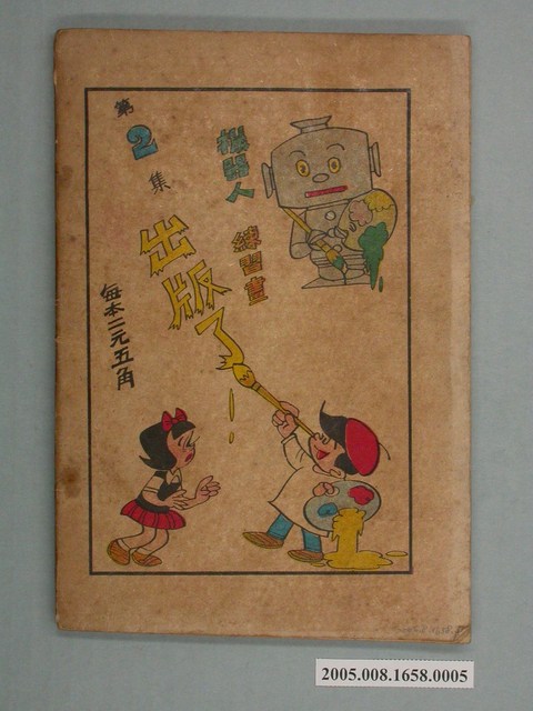 1.本件《興欽畫刊75-機器人幫泰山決戰象牙谷(8)》,封面以小金等小朋友被原住民擄獲,公主坐大象前來搭救的情景為主題。內容敘述小金等進入到部落後,因誤會而被原住民視為是入侵者。封底為漫畫廣告。2.劉興欽於1934年出生於今新竹縣橫山鄉,1954年開始畫漫畫。其正式投入漫畫,是擔任北市永樂國小教師期間。1971年到1979年從事發明,獲得國內專利140多項、國際專利43項。於1991年移民美國舊金山,在《北美世界日報》連載漫畫「大嬸婆在美國」,並於舊金山創立「大嬸婆創意學校」免費教導華人子弟學習母語,同時也致力於「臺灣民俗紀錄」畫作,至今已經累積305多幅作品。該漫畫家以〈阿三哥與大嬸婆〉等漫畫,著稱於世。