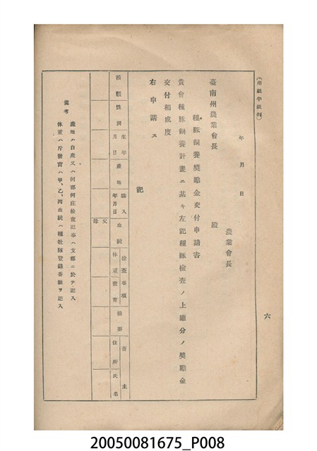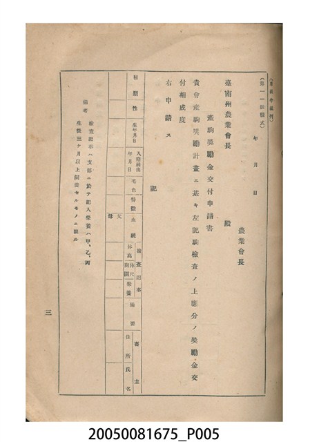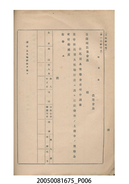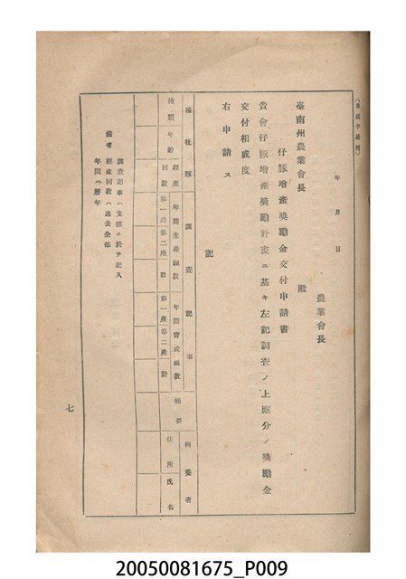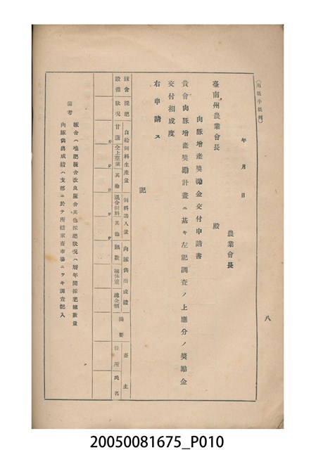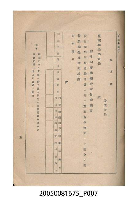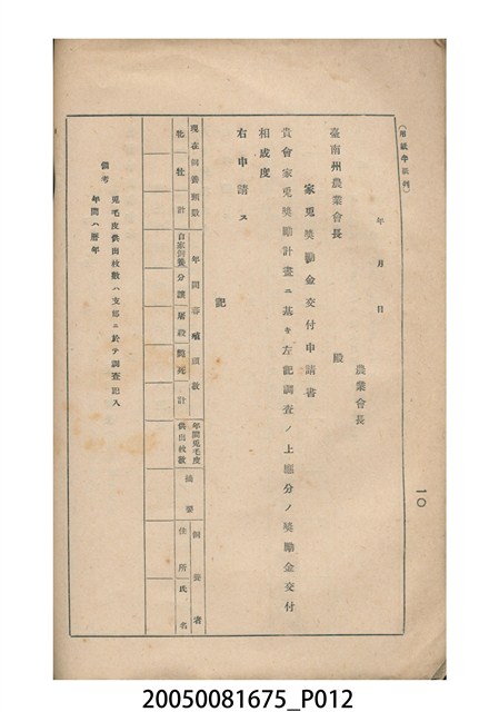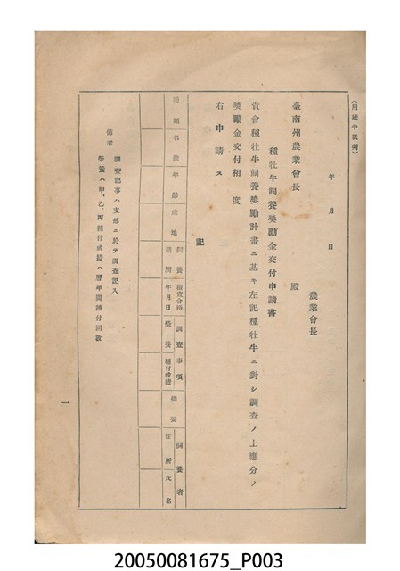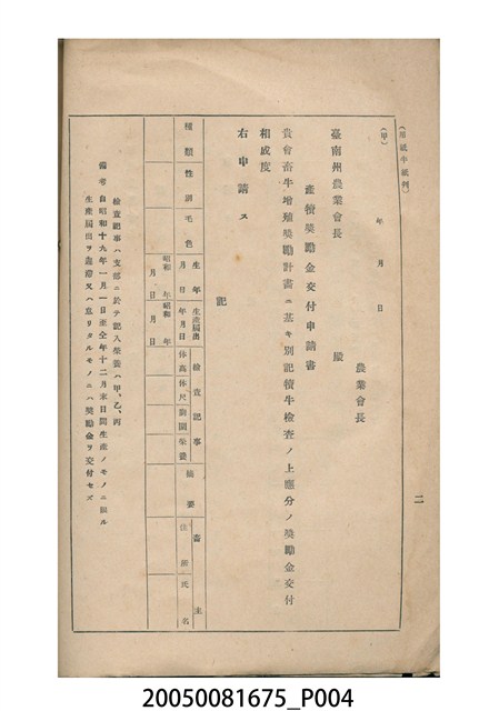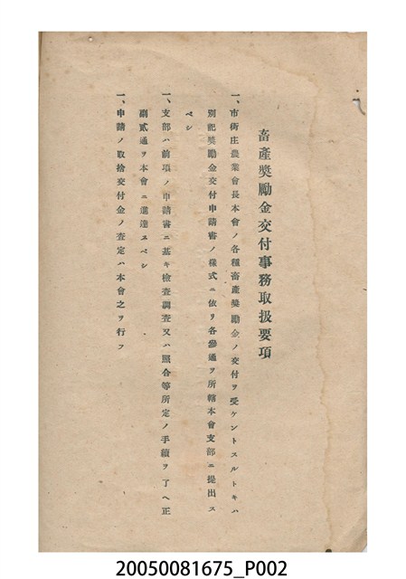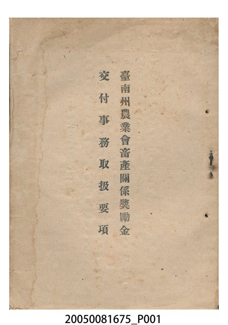 1.本物件為「臺南州農業會畜產關係獎勵金 交付事務取扱要項」,為臺南州農業會各式畜產獎勵金的申請及處理準則,可申請的家畜包含豬、牛、雞、兔等。封面中央為書名「臺南州農業會畜產關係獎勵金交付事務取扱要項」。