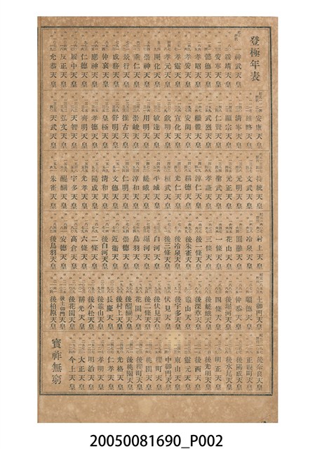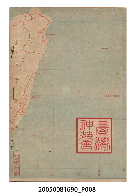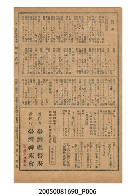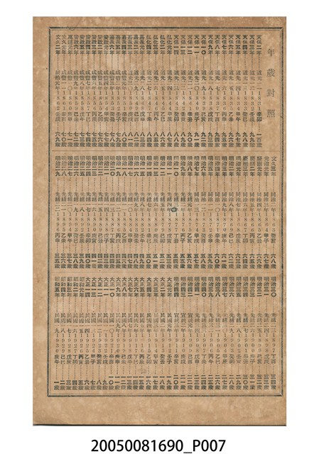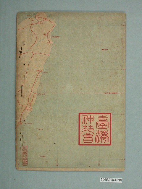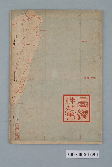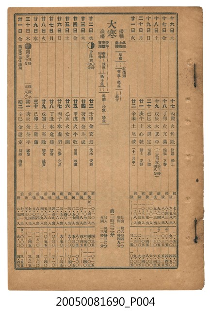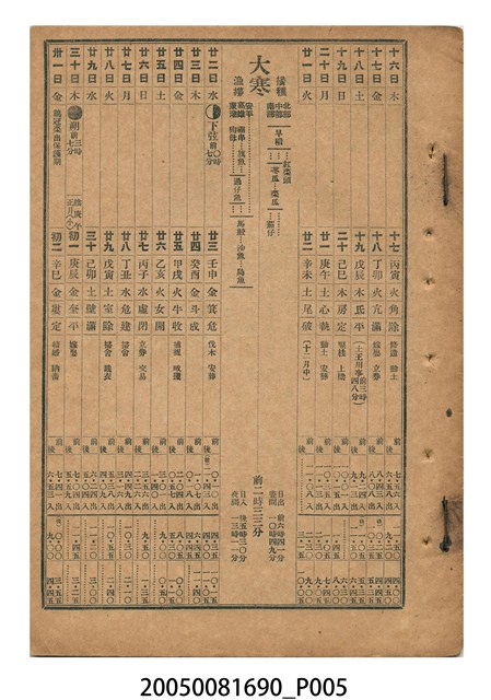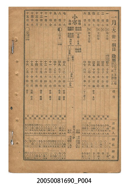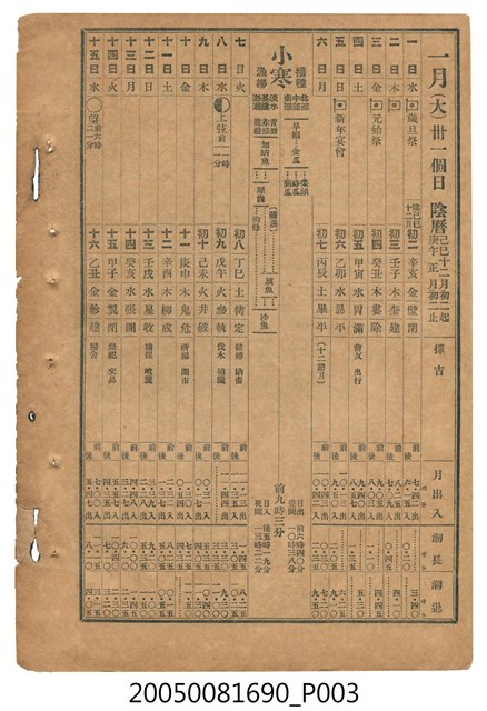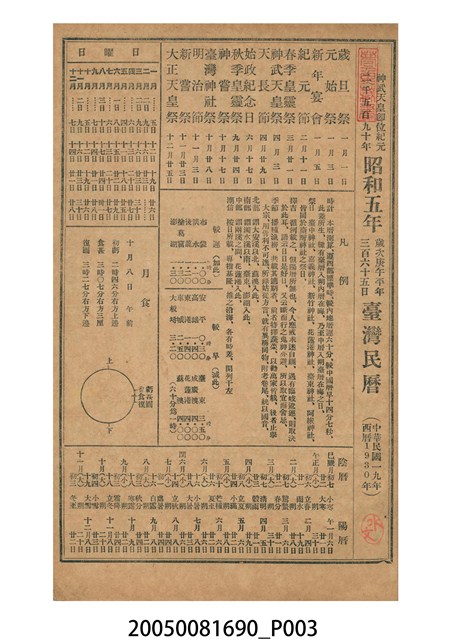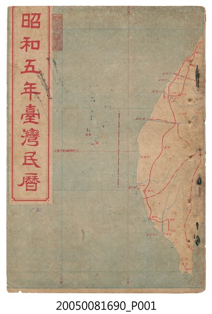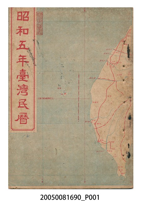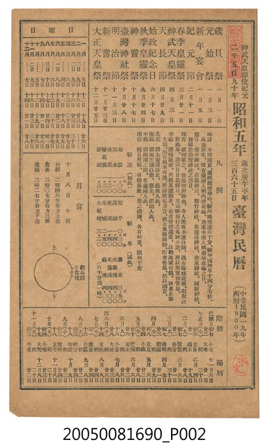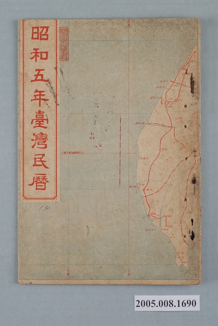 1.本件為「昭和五年《臺灣民曆》」,右翻,共有二種裝訂痕跡,「二釘裝訂」釘在書本的近書溝的附近、「孔裝」打洞在近書溝的附近,封面四邊摺痕、泛黃嚴重,多處汙損。封面以臺灣西南部經緯地圖為封面,以紅色白底楷體呈現「昭和五年臺灣民曆」八字,旁有一方「夢龜藏書」印痕。以臺灣東北部經緯地圖為封底,有臺灣神院會的鈐印,以及「夢龜藏書」印痕。2.封面裡為「登極年表」載歷代天皇登基時間,歲時節慶多與日本民俗相關,不見現今臺灣熟悉的節慶,表上記有「歲旦祭」、「元始祭」、「新年宴會」、「紀元節」、「春季皇靈祭」、「神武天皇祭」、「天長節」、「始政紀念日」、「秋季皇靈祭」、「神嘗祭」、「臺灣神社祭」、「明治節」、「新嘗祭」、「大正天皇祭」。