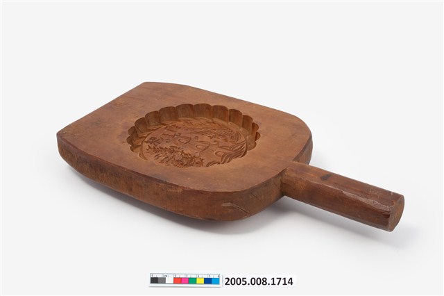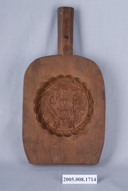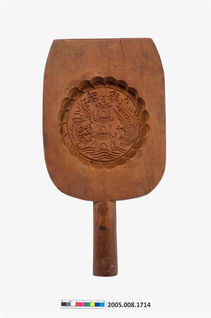 2005.008.1714 長方形單面雕圓形龍鳳塔紋帶柄餅印