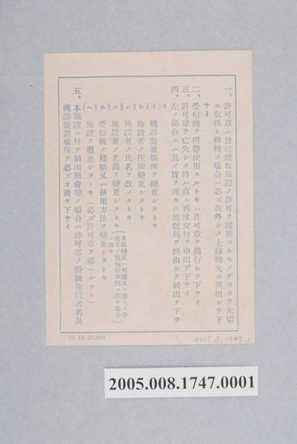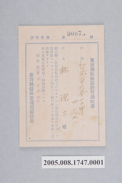 1.本物件為放送聽取施設許可通知書,通知書上的許可號為「第90873」,住所為臺北市,氏名「林源三」,於昭和17年(1942)5月26日許可的日期,官方署名為臺灣總督府交通局遞信部。2.1926年初臺灣總督府公布實施「臺灣廣播聽取規則」時,受許可者應為少數特定人,擁有的收音機也以能夠接收島外電波的昂貴機種為主並且需要繳交年費。1942 年底「二重放送」開播後,當時臺灣人的聽取者數兩度呈現較為顯著的增加,學者認為其特色是一方面使用臺語的「時局放送」時間增加,另一方面則因對戰爭消息的關心升高所致。