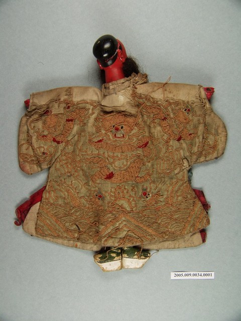 本件保存尚可,為布袋戲角色關公之戲偶,身著粉色長袍,胸前有繡大型龍頭,綠色鞋子,偶頭臉部紅色,鼻子些許斑駁,眉尾上揚,鬍鬚長及腰。
