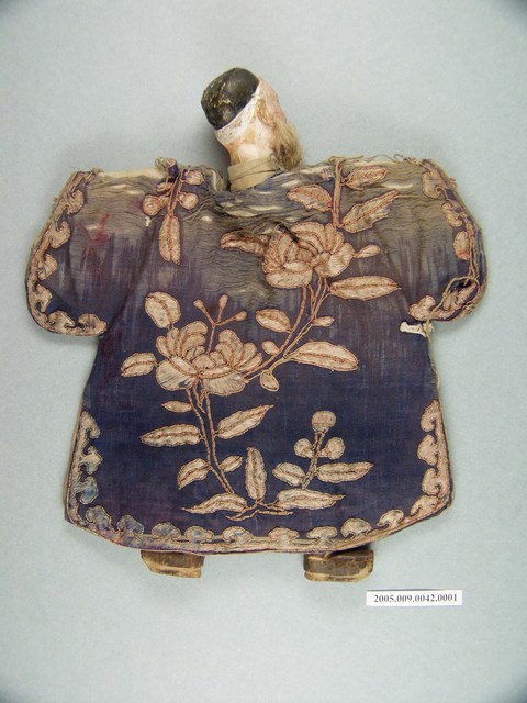本件保存狀態尚可,為布袋戲文村公(文長)之戲偶,身著藍色右衽長袍,布料些許褪色肩部破損,白色繡花粉色鑲邊。偶頭特徵,髮白脣紅面白,白色鬍鬚長度及腰,帽子藍色,後腦杓處兩條藍色綁帶長度及腰。