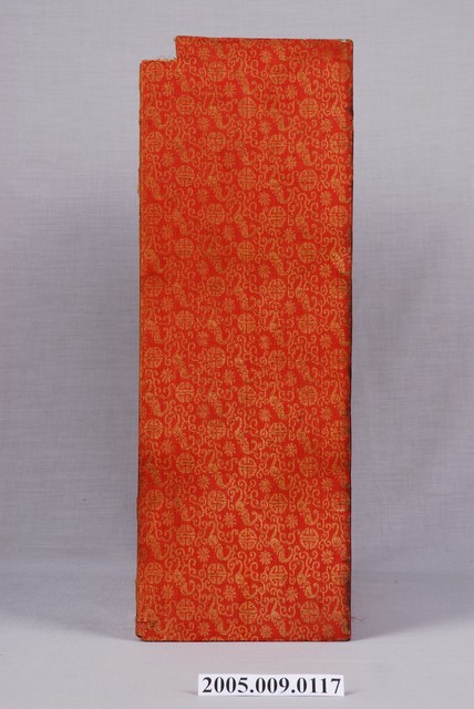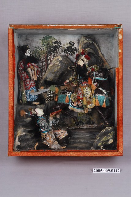 1.本件為紙尪仔框景,內容為土山約三事,曹操降伏關公,並厚禮之的劇目。框景邊框已略有破折。2.紙尪仔是民間紙紮的尪仔,作工精細不亞於布袋戲偶,並以一齣齣的戲曲故事為題材,常見「天官賜福」、「大鬧天宮」,或以《三國演義》內的相關傳說等,組合成一套套的框景,當作餽贈的禮品或家中的擺設,有時也用於中元普渡上,與看牲一同祭祀。