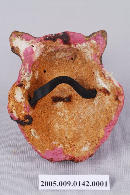 1.本件土黏香戲偶雙角紅面怪指偶偶頭,是帶有布製偶身戲偶之偶頭,造型為張嘴形象,頭上有黃金色雙角,臉部呈略紅的粉紅色,眉毛、眼圈畫黑,嘴、牙齒分隔畫紅,兩耳各鑽一孔,鼻頭有破損掉漆情形。2.戲偶俗稱「尫仔」,由偶頭、偶身、手、腳、服飾、裝飾等組成,偶頭多以木刻、紙糊等材質製做出形貌,外觀再上漆或彩繪。臺灣早期戲班使用的偶頭大多從泉州進口,稱為唐山頭,其中以「花園頭」、「塗門頭」最有名。「土黏香」戲偶偶頭是以線香香料混合木屑製作而成的戲偶偶頭。