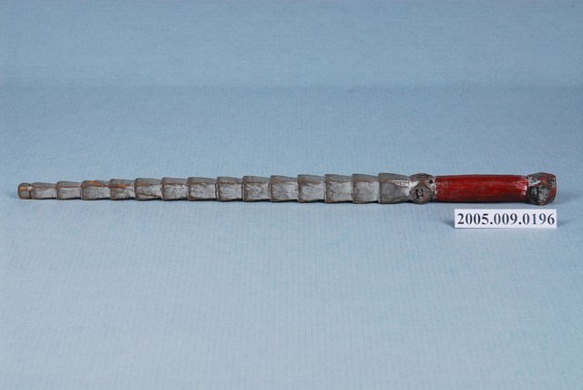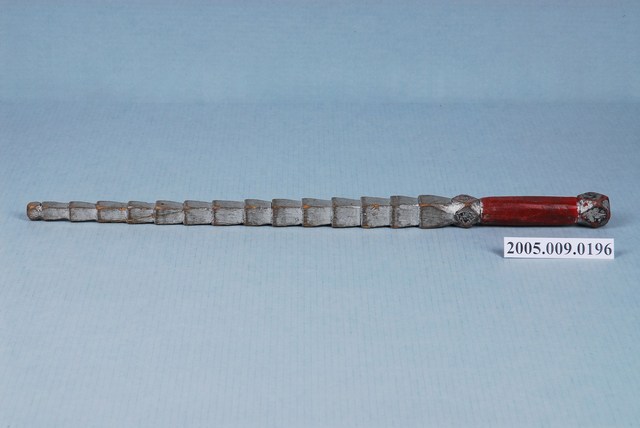 本件子弟戲兵器木製打神鞭是以方形木棒雕刻而成,握把雕成外凸圓弧狀,握柄兩端修飾成菱形狀,打神鞭本體呈現分節狀,每節靠近握柄一端向內削除,最尾端修飾呈方塊狀,握柄塗上紅漆,打神鞭部份及握把兩端塗上白金色漆,邊角處有磨擦掉漆情形,打神鞭尾端有斷裂接合的痕跡,大抵保存完整。
