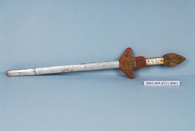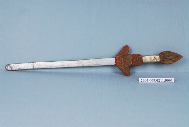 本件是子弟戲兵器附劍鞘木製帶柄劍的劍身,以木片雕刻而成,劍柄有白色塑膠護膜,劍柄末端、護套有雕花,塗紅色漆,劍身呈直條片狀,尾端呈圓弧狀,外觀老舊,大致保存完整。