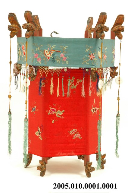 本件吉祥花蟲繡紋宮燈,分為下燈罩、上燈罩、宮燈骨架與流蘇綴飾4大部件。傳統之宮燈以木製骨架作長筒六角形,骨架雕刻精美紋飾,燈罩又分上罩與下罩,上罩顏色不定,下罩多為紅色居多,且多以緞、絹、紗作燈罩,表面以刺繡裝飾各種圖紋。現今已少見織品製作之燈罩,取而代之的是整體為壓克力製作的宮燈。