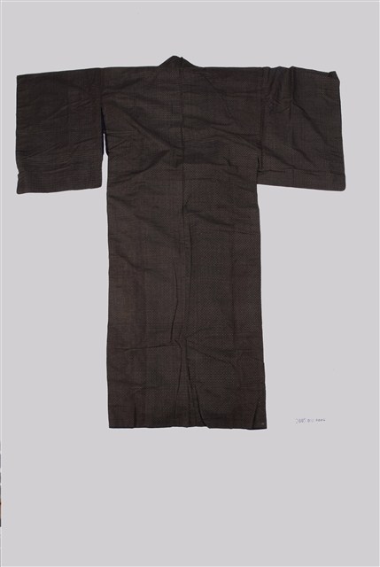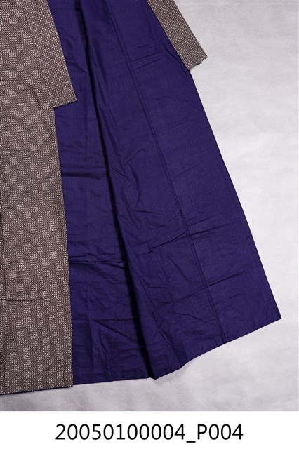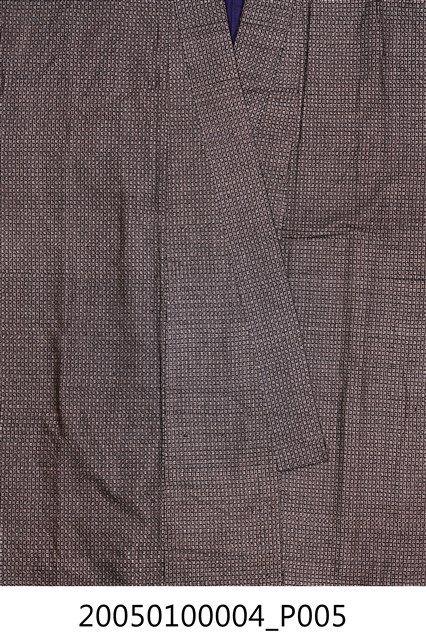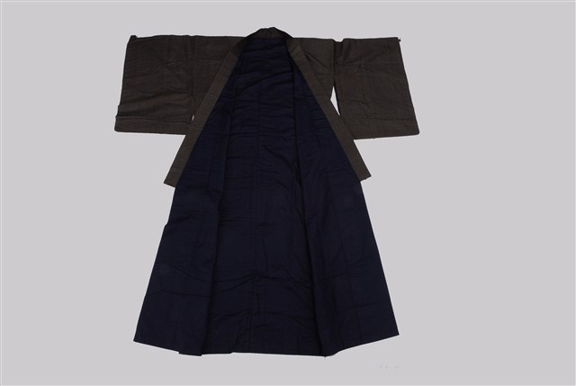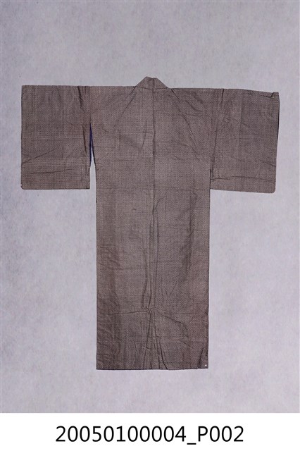 1.此件服裝為長袍式和服,雙層結構,表布是深棕色與白色交織的棉質面料,裡布是深藍色,曲領、接袖,腋下留有部分未塞縫的空隙,是和服袖的特色;因為製作裁剪的關係,前片門襟部分都會有直向的剪接布片,次服裝為日本男性日常穿著的浴衣款式,是較簡化版和服,通常作為常服非正裝,一般不用於正式場合。2.和服(kimono)是日本的民族服飾,明治時代(1868年–1912 年)以來,日本服裝主要分為「洋服」(現代服裝)和「和服」(傳統服裝),因西方衣服(即)的流入,遂用「洋服」以將其與日本本地的衣服作分別,加上19世紀末20世紀初,日本國族運動興起,產生了大和民族的概念,後來為了將西方的衣物作分別,「和服」逐漸演變成單指日本民族服飾的專稱。