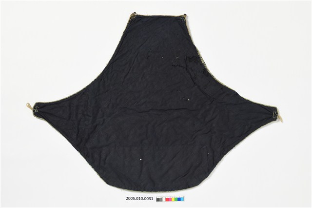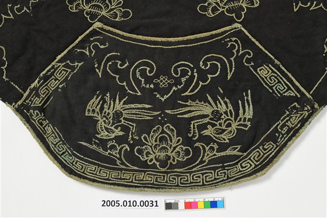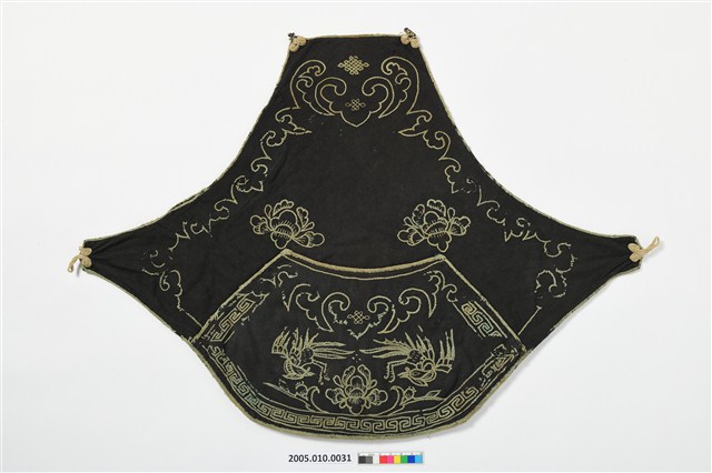 2005.010.0031 黑色地彩繡牡丹花紋下端寬形肚兜