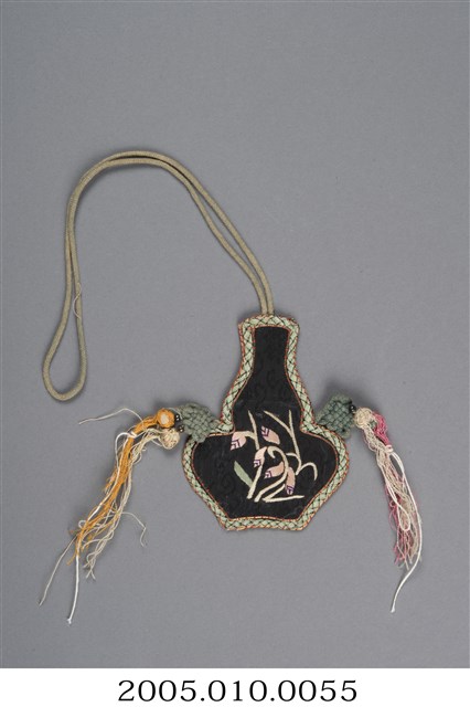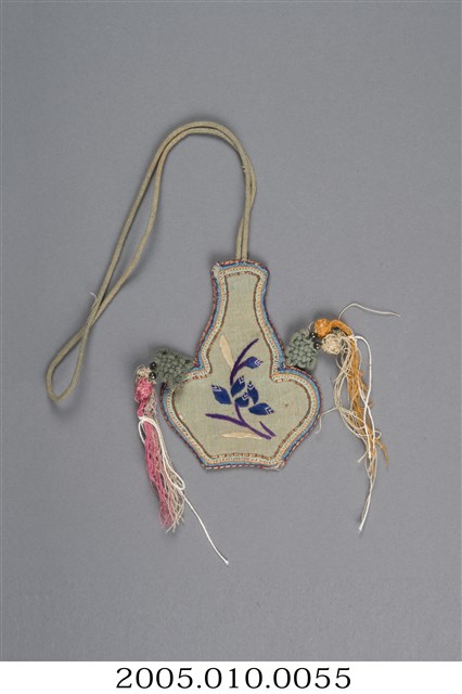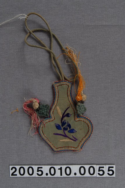 1.本件為綠緞底葫蘆型菸草袋。在菸草袋上方有綠繩可用以佩掛腰間,葫蘆腰兩側墜有盤長結,盤長結下方墜有粉紅米白、橘黃米白雙色結穗。紋樣部分,以纏針繡有折枝花卉。在菸草袋邊緣以釘金繡、鎖邊繡做五層邊飾,左方葫蘆腰處的結邊有脫落情形。2. 本件購自蘇麗嬌女士。煙草袋為早期先民常見配飾,有繩可佩掛在腰間,用以放置煙草,方便外出需要吸菸時取用。而墜在兩側的結穗則可在行走間形成飄逸瀟灑的效果。