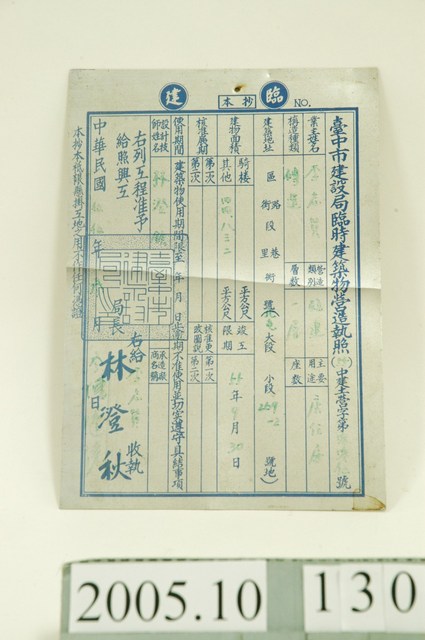 2005.010.0130 民國55年臺中市建設局臨時建築物營造執照