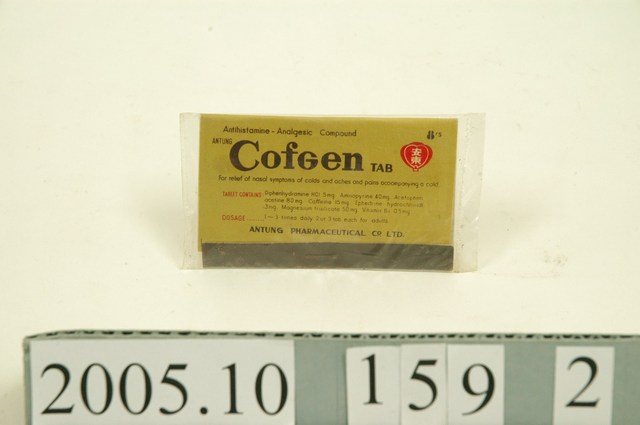 1.本件安東藥業「克風錠」,為綜合藥品配置部「仙桃」寄藥包組之組件2,長11.9cm、寬6.5cm、高0.8cm。該藥品分為兩層包裝,內層紙製及外層透明塑膠膜密封,內層紙袋彩色印刷,封面中間為藥品名稱「克風錠」紅色粗體字樣,名稱左右則印有「安東」小型字樣及「安東」心型商標圖案,名稱上方有「新感冒綜合良藥」、「 8錠」及「衛藥製第5793號」,下方則載明該藥成份、主治、用法及製藥商「中國 安東製藥股份有先公司 台灣」字樣,封面右下角有一個圓形鏤空區域,可看見藥錠,封底設計排版與封面一致,內容為封面的英文版本。藥錠呈淡黃色圓形,中間有切痕方便民眾剝半服用。由說明可知本藥為緩解感冒症狀為主的一般感冒藥。2.1949年國民政府遷台後,積極鼓勵民間設置藥廠,因此以製造一般成藥為主的小型藥廠大幅增加,令受惠於當時醫療資源匱乏,交通不便,寄藥包與成藥因取得容易,使用方便的特點,成為1950年-1970年臺灣醫療服務的主流,然當時藥政管理的相關法令並不完備,藥廠及藥品品質參差不齊,直至1970年8月中央公佈實施 「藥物藥商處理法」,加強藥政管理後,寄藥包方逐漸式微。
