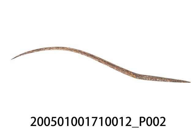 1.本物件為前端彎曲的金屬彎鉤針,會安裝在錐子上使用,是鞋匠製鞋、補鞋用來刺出鞋底縫線孔的工具。