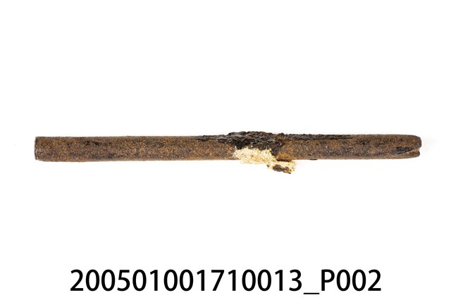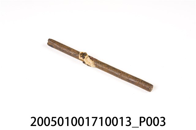 1.本物件為1支金屬製的環釦斬具,斬具棒身中央略有鏽蝕凹陷,環釦斬具可用於皮革上安裝各種五金釦環件的組合,有各種不同大小直徑,使用時與皮面保持垂直,對準釦面,以槌子敲擊。