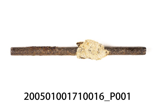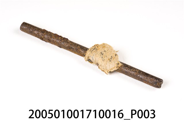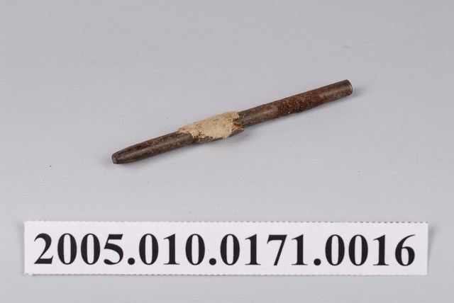 1.本物件為一支金屬製的環釦斬具,棒身上纏繞一塊布料纖維。環釦斬具可用於皮革上安裝各種五金釦環件的組合,有各種不同大小直徑,使用時與皮面保持垂直,對準釦面,以槌子敲擊。