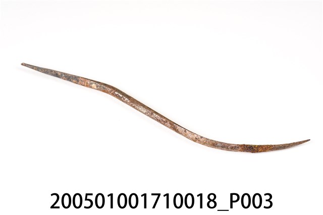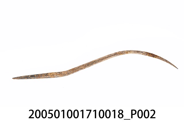 1.本物件為前端彎曲的金屬彎鉤針,會安裝在錐子上使用,是鞋匠製鞋、補鞋用來刺出鞋底縫線孔的工具。