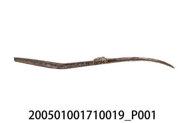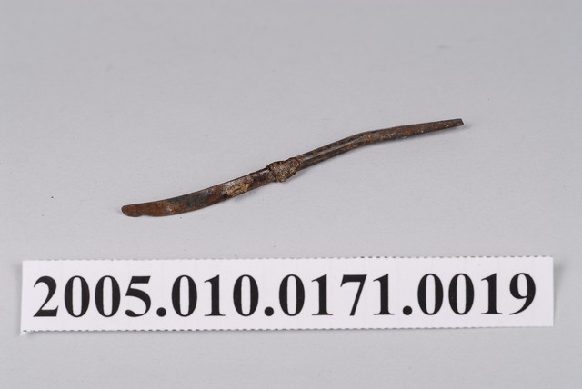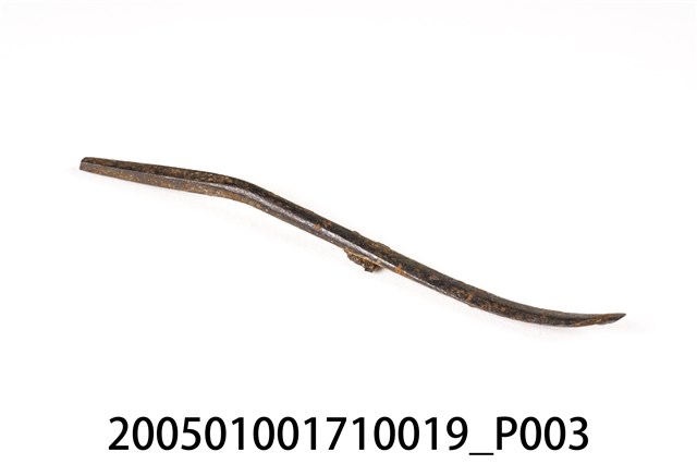 1.本物件為前端彎曲的金屬彎鉤針,會安裝在錐子上使用,是鞋匠製鞋、補鞋用來刺出鞋底縫線孔的工具。
