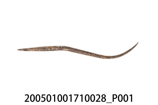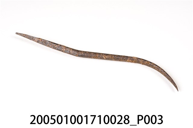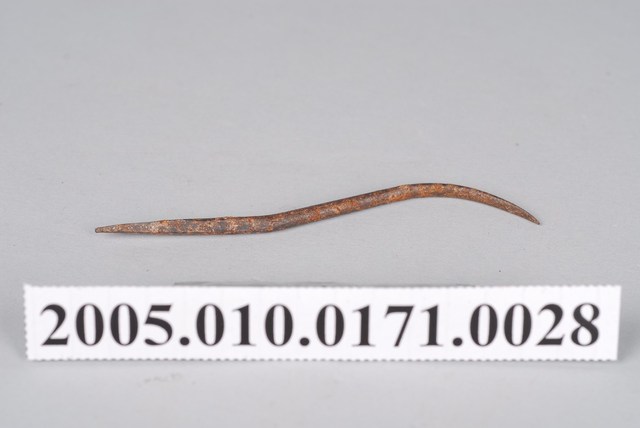 1.本物件為前端彎曲的金屬彎鉤針,會安裝在錐子上使用,是鞋匠製鞋、補鞋用來刺出鞋底縫線孔的工具。