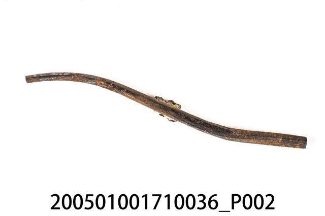 1.本物件為前端彎曲的金屬彎鉤針,彎鉤的針尖處已斷裂不見,彎鉤中央有修補黏合痕跡。彎鉤針會安裝在錐子上使用,是鞋匠製鞋、補鞋用來刺出鞋底縫線孔的工具。