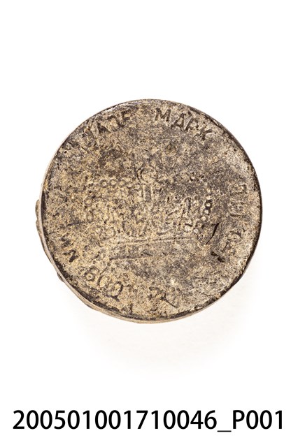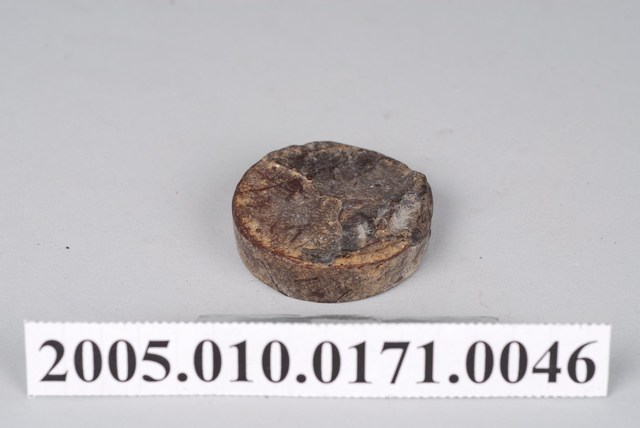 1.本物件為一塊圓形蠟塊,一面中央刻有皇冠圖案,外圍可辨識字跡有「MARK」、「B02」字樣;另一面有不規則鑿痕。蠟塊可用來摩擦鉤針方便穿孔,或是讓縫線增加堅韌度。