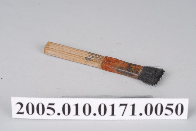1.本物件為木製握柄,以鐵片固定接合前端刷毛的刷具。刷具是鞋匠用來為鞋子上膠或上色所使用。