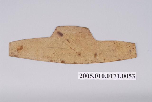 1.本物件是根據鞋款設計,繪製而成的平面紙板,利用紙板可在皮革上轉繪出鞋面各部位形狀,再進行裁剪、削薄加工、組合,進而製作鞋面。