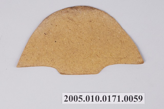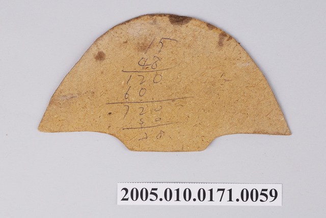 1.本物件是根據鞋款設計,繪製而成的平面紙板,紙板上註記有15乘48直式算式。利用紙板可在皮革上轉繪出鞋面各部位形狀,再進行裁剪、削薄加工、組合,進而製作鞋面。