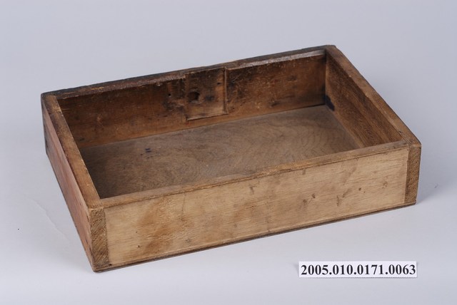 1.本物件為一個長方形木製箱子,無蓋子,長邊一側可見曾有安裝把手裝飾的痕跡。