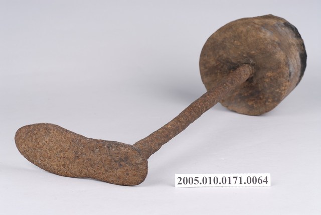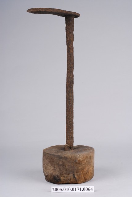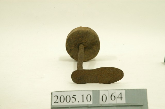 1.本物件為一支鐵腳及一個木塊底座所組成。鐵腳由生鐵製作成一個腳掌狀的鐵塊,並固定在長條鐵柱上,鐵柱最下方插入圓形木塊底座。木塊底座則用來支撐和固定鐵腳,以方便鞋匠使用。