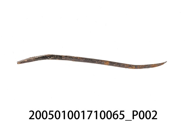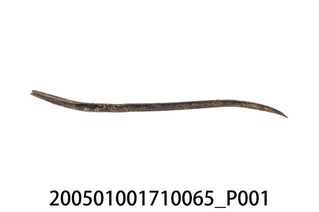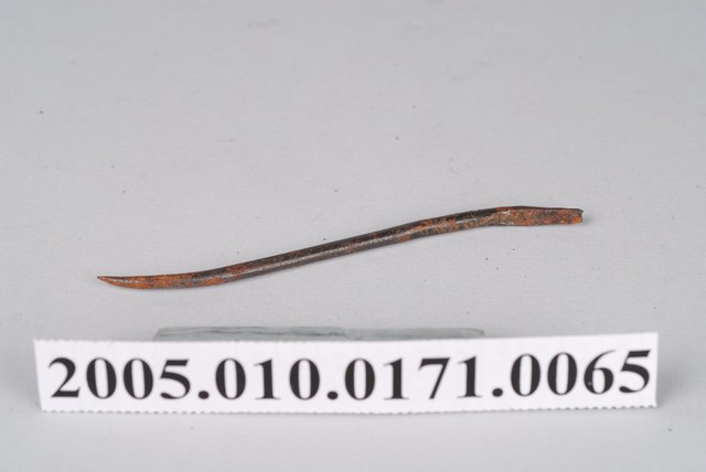 1.本物件為前端彎曲的金屬彎鉤針,彎鉤針會安裝在錐子上使用,是鞋匠製鞋、補鞋用來刺出鞋底縫線孔的工具。