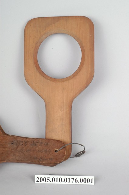 本物件為日治時期柑桔組合量器一組之一,此物件材質應為木材,共有四件為一組,此為其中一件。此物件外觀是前端方形面,方形中間有一鏤空圓形,尾端木炳有一小孔,用來穿繩,木柄上印有「檢驗局」章戳,以及寫有「一」字。此物件是用來測量農作物(如柑橘類)的大小並篩選之。