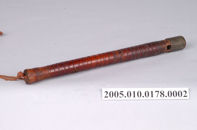 本物件為閹豬工具組之笛子,為一簡易木質短笛,指孔較少,尾端有綁繩,本物件放置於閹豬工具組內。閹豬為臺灣鄉間傳統的做法,認為將仍是小豬仔的公豬閹割,肉質會較為滑嫩鮮美,並減低臊味,另發展出「閹豬師」之行業,其會帶著工具到農村並吹奏短笛通知各戶人家,並替公豬閹割。