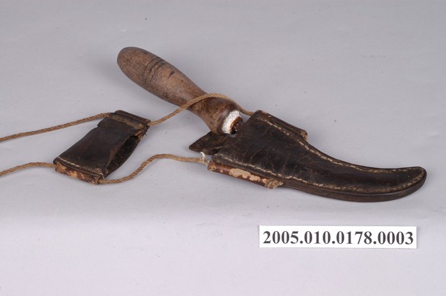 本物件為閹豬工具組之閹刀一套,有閹刀以及皮革刀套,其刀套上有綁繩,閹刀則有木質刀柄,刀刃則呈現微彎幅度,本物件放置於閹豬工具組內。閹豬為臺灣鄉間傳統的做法,認為將仍是小豬仔的公豬閹割,肉質會較為滑嫩鮮美,並減低臊味,另發展出「閹豬師」之行業,其會帶著工具到農村各戶人家替公豬閹割。