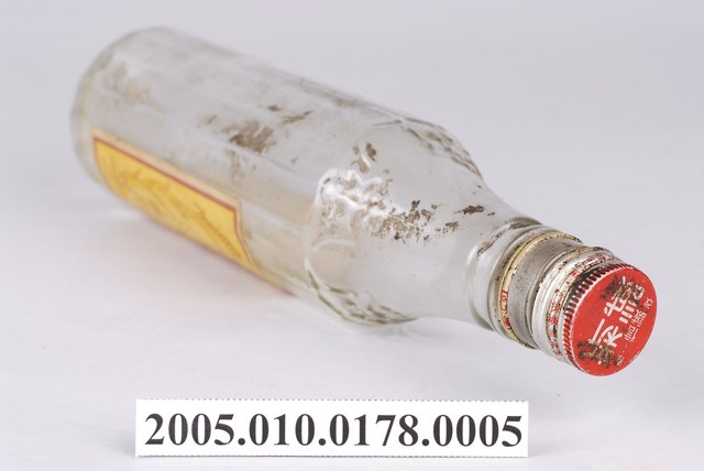 本物件為閹豬工具組之酒瓶,為臺灣高粱酒之酒瓶,黃、紅配色商標上有「建設臺灣、復興中華」字樣,並有「中華民國台灣省菸酒公賣局字樣」,本物件放置於閹豬工具組內。閹豬為臺灣鄉間傳統的做法,認為將仍是小豬仔的公豬閹割,肉質會較為滑嫩鮮美,並減低臊味,另發展出「閹豬師」之行業,其會帶著工具到農村各戶人家替公豬閹割。