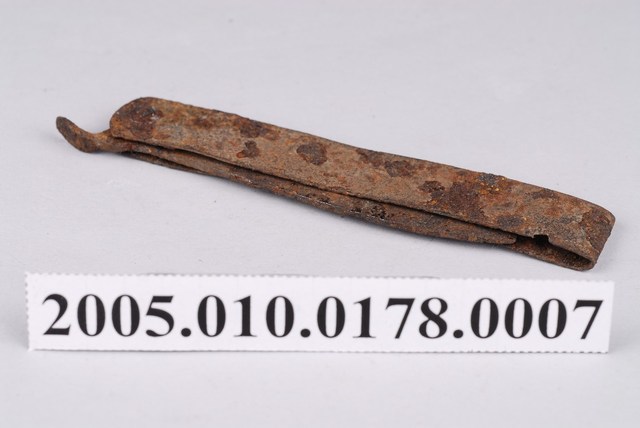 本物件為閹豬工具組之刀片,為金屬材質,表面嚴重鏽蝕,其為摺疊刀,可將刀刃收摺進刀柄,本物件放置於閹豬工具組內。閹豬為臺灣鄉間傳統的做法,認為將仍是小豬仔的公豬閹割,肉質會較為滑嫩鮮美,並減低臊味,另發展出「閹豬師」之行業,其會帶著工具到農村各戶人家替公豬閹割。