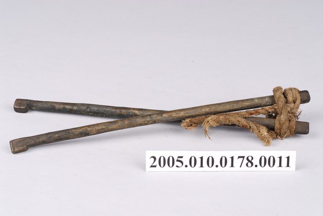 本物件為閹豬工具組之鐵件,其為兩支長型鐵件,其中一側以麻繩綁起,本物件放置於閹豬工具組內,推測為固定豬隻所用。閹豬為臺灣鄉間傳統的做法,認為將仍是小豬仔的公豬閹割,肉質會較為滑嫩鮮美,並減低臊味,另發展出「閹豬師」之行業,其會帶著工具到農村各戶人家替公豬閹割。