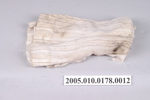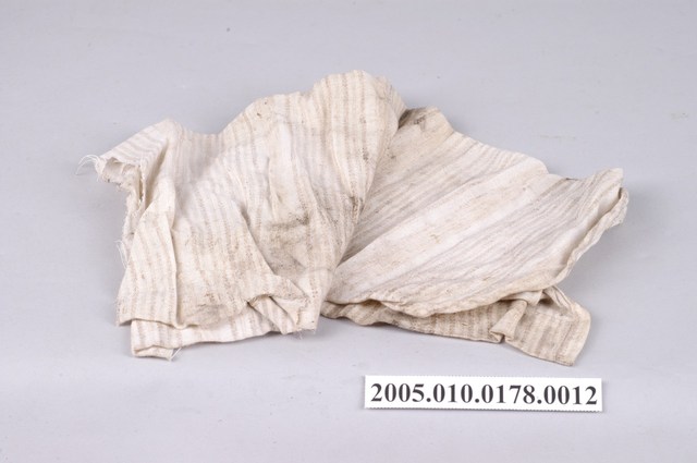 本物件為閹豬工具組之布,為淺色條紋布,多處有髒汙,本物件放置於閹豬工具組內。閹豬為臺灣鄉間傳統的做法,認為將仍是小豬仔的公豬閹割,肉質會較為滑嫩鮮美,並減低臊味,另發展出「閹豬師」之行業,其會帶著工具到農村各戶人家替公豬閹割。