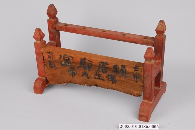 五營神將為臺灣民間安奉守護轄境之神,常見有「張蕭劉連李」配合東西南北中五營之組合,以中壇元帥李哪吒為主帥,其奉祀形式常見以代表五營神將的五顆偶頭,集中頭豎立於營斗之上,以為五營神兵之統帥。依木座上棉布文字「臺中、賴厝廍、保生大帝」,推測本組可能為臺中北屯庄的元保宮所屬之五營,惟棉布上書「南屯」有矛盾之處,需進一步考證。