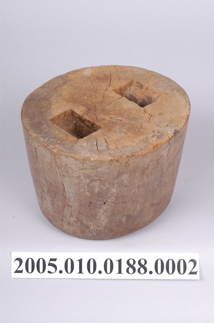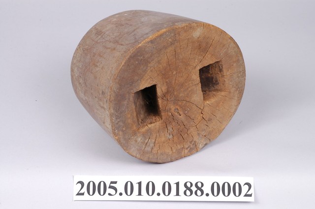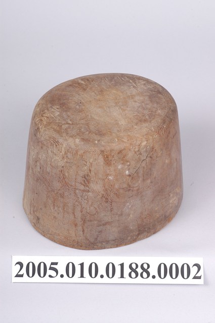 1.本物件為木製圓柱形草帽模,底部有2個長方形孔洞,又稱「帽仔模」,用於編織草帽頭型。草帽模是要編草帽時有一個帽模,編帽人在帽模上來編,如此帽子大小都有一定的形狀,雖是手工,但定型可量產。