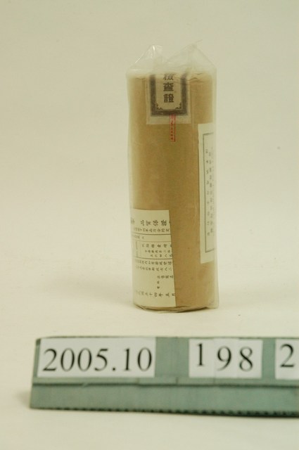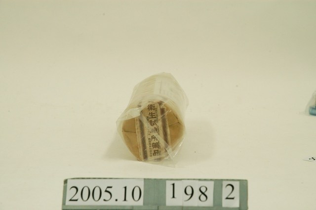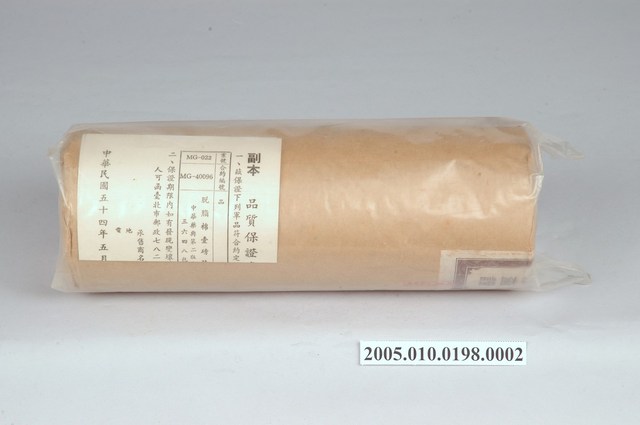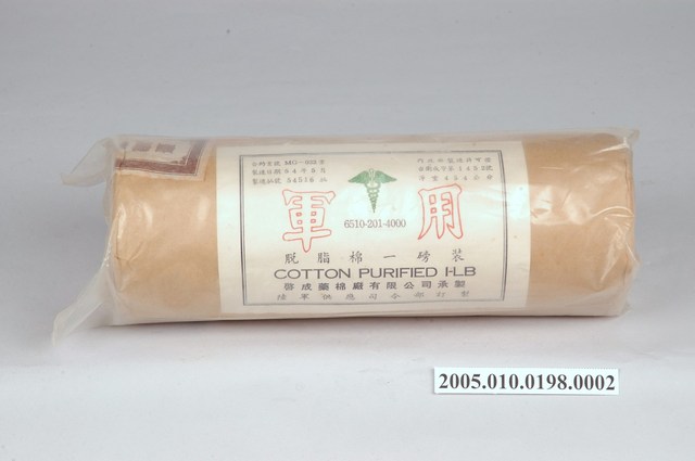 1. 本物件為醫藥棉花。包裝成圓柱型,最外層包裝為塑膠包材。塑膠包裝內部有一說明物件,其上印有軍用、脫脂棉一磅裝、COTTON PURIFIED I-LB、啟成藥棉廠有限公司承製和陸軍供應司令部訂製等字樣。另,塑膠包裝內有品質保證書。棉花被似牛皮紙包材包著,封口貼有封緘。 2. 本產品標有製造日期54年5月字樣,藉由品質保證書可以判定此紀年為民國。