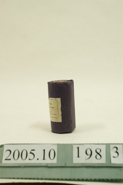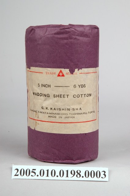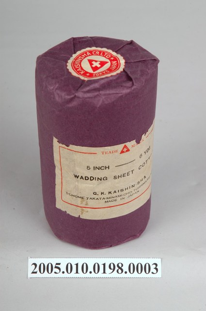 本物件為醫藥棉花。包裝成圓柱型,外層包裝上貼有標籤紙,其上印有商標和文字,分別是5 INCH-6YDS、WADDING SHEET COTTON字樣和製造商資訊。封口貼有圓型封緘。