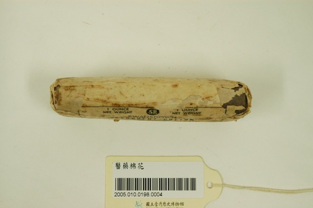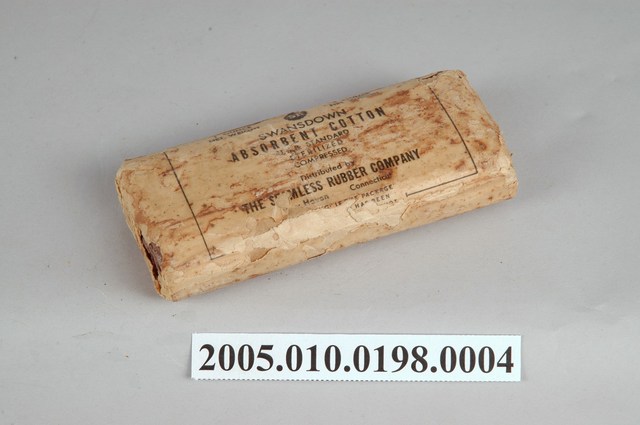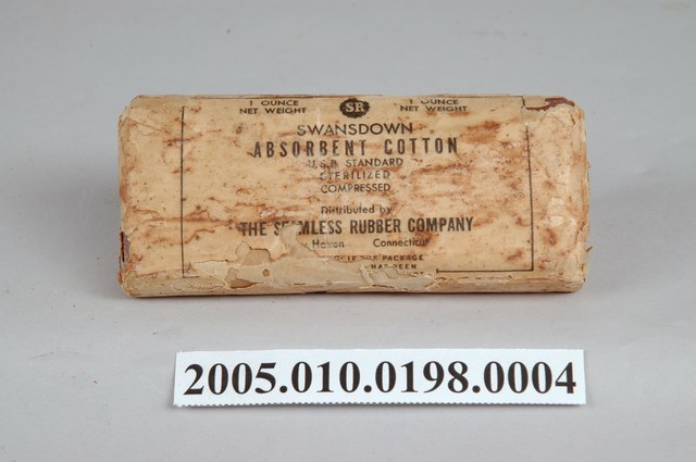 本物件為醫藥棉花。包裝成長方體,外層包裝僅有一面有英文字樣,分別為1 OUNCE NET WEIGHT、SWANSDOWN、ABSORT COTTON、U.S.R. STANDARD、STERILIZED和COMPRESSED等字樣。