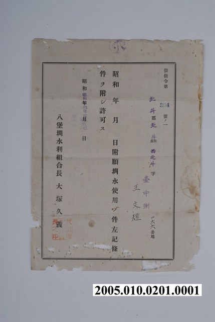 本件為昭和14年(1939)以八堡圳水利組合長大塚久義名義發給北斗郡北斗街西北斗266番地的王文短的指令,告知其申請使用圳水已許可,背面則為許可條件,記載土地所在地為北斗街東北斗1123番,3甲5分7厘2毫5絲。使用期限自昭和13年(1938)4月1日至昭和14年3月31日,計一年。以及相關使用規則及違反規定的處裡。