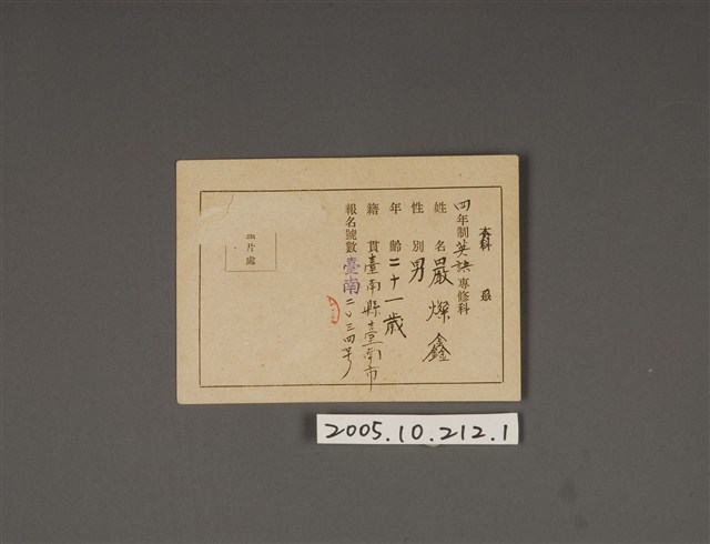 1.本文物為臺灣省立師範學院准考證,紙質文物。文物正面可見「臺灣省立師範學院准考證」、「臺南區第2034號」、「給四年制英語專修科考生嚴燦鑫」字樣,物件右上方可見1個「臺灣省立師範學院」的藍紫色長方戳印。2.現國立臺灣師範大學在1946年至1955年此期間稱為「臺灣省立師範學院」,因戰後需要大量的中學與高中師資,因此臺灣省行政長官公署於民國35年(1946)6月5日成立臺灣省立師範學院,負責中等教育師資的人才培育。