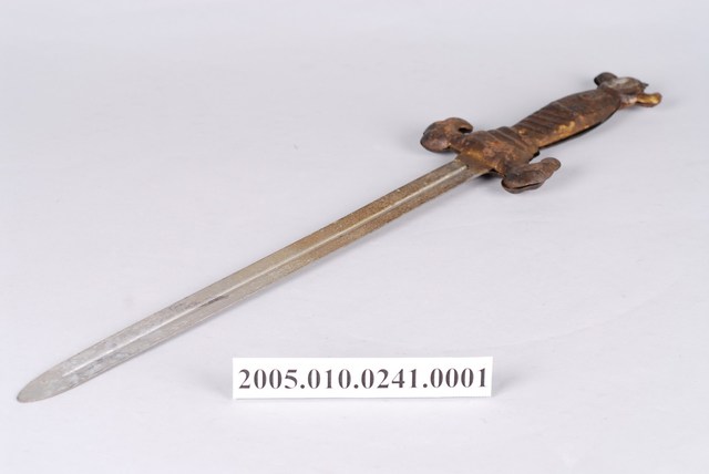 本物件為劍身主體,為鐵製材質,劍身部分生鏽,劍柄生鏽剝離,劍線中間為一凹槽,劍柄與劍格處生鏽嚴重,劍格形狀為勾雲狀,劍柄處有斜線紋路,劍首處為牛角狀。