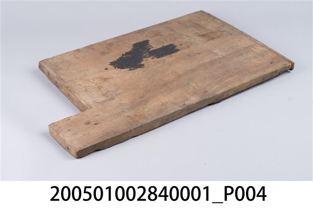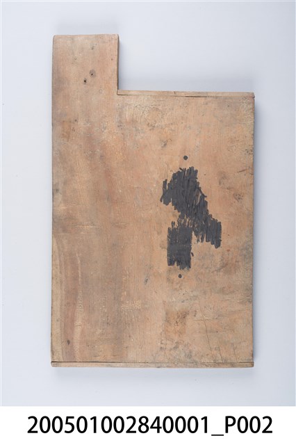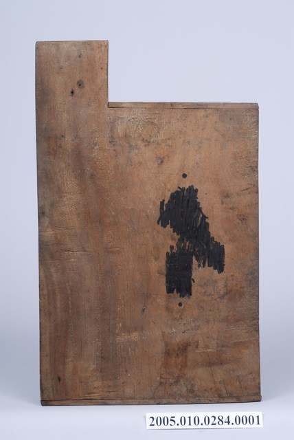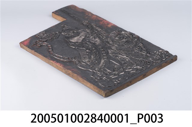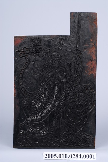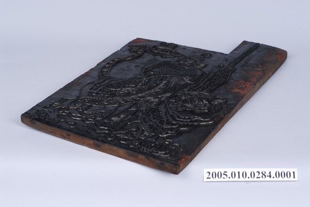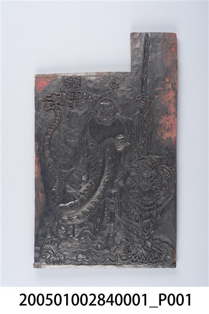 本件版印雕刻張天師騎虎圖,張天師持劍騎於虎上,左上方另有一方印。此版印背面木板受黑墨染黑一部分。