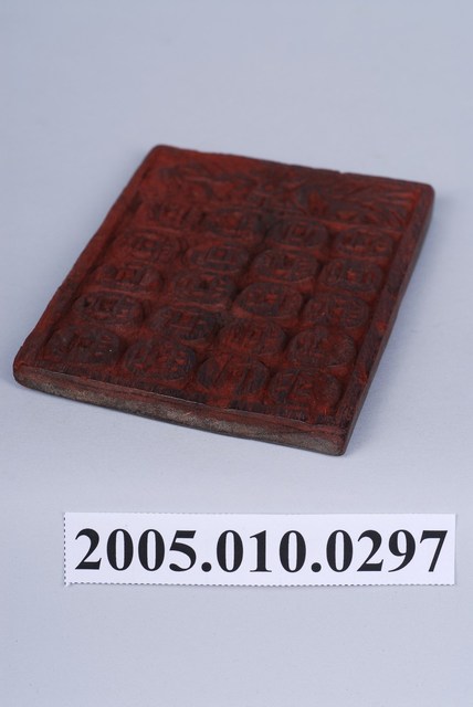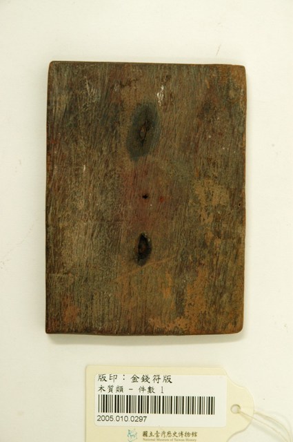 本件金錢印版,一塊長方形薄木版單面雕刻,尚存紅墨殘跡,畫面主要由金錢紋由4乘5,計20個組成。印版結合雕刻和印刷藝術,古代廣泛運用在刊印書籍,宗教民俗的版畫、符令、籤詩、疏文等印刷物上。